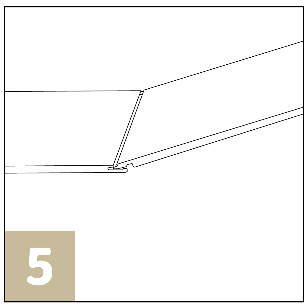 同時,將兩塊地板產品同時傾斜,沿著傾斜方向推入短邊連接處( 見圖6 ),同時將長邊斜插入第一排的母榫中。按照如上步驟完成鎖扣安裝。