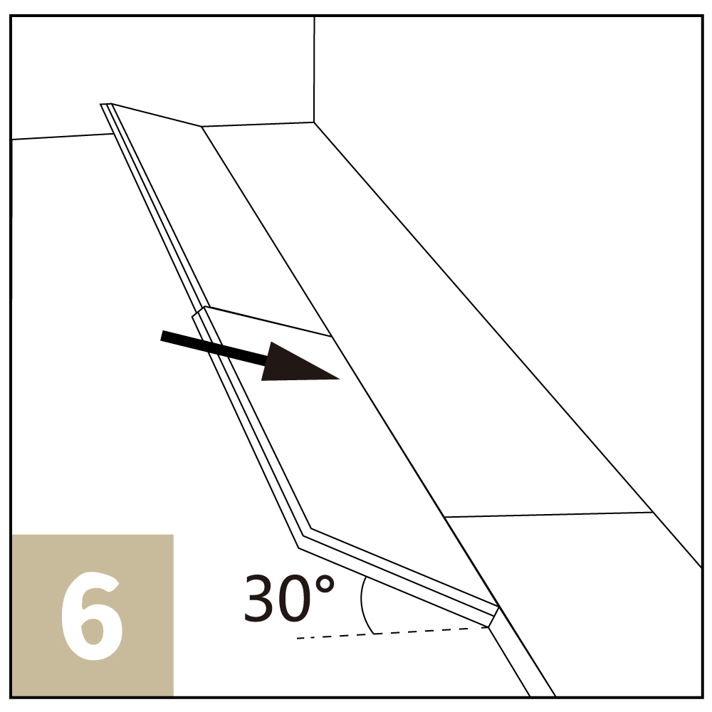 安裝時,將需要安裝的地板產品的短邊以約30度的角度斜插入已安裝的地板的短邊( 見圖5 )。