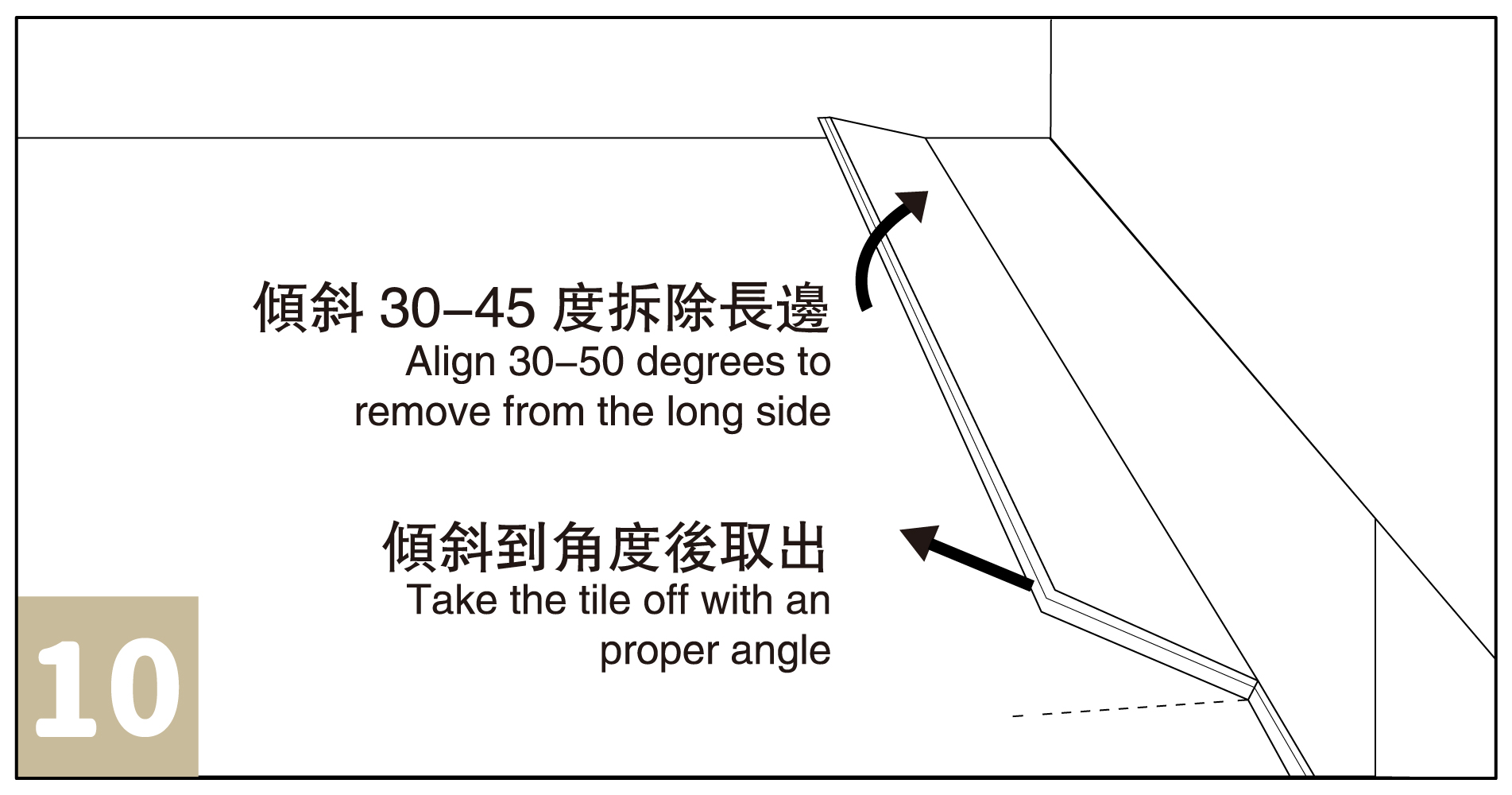 將需要拆除的地板傾斜30-45度,然後平行取出,按照如此步驟拆除長邊( 見圖10 )。