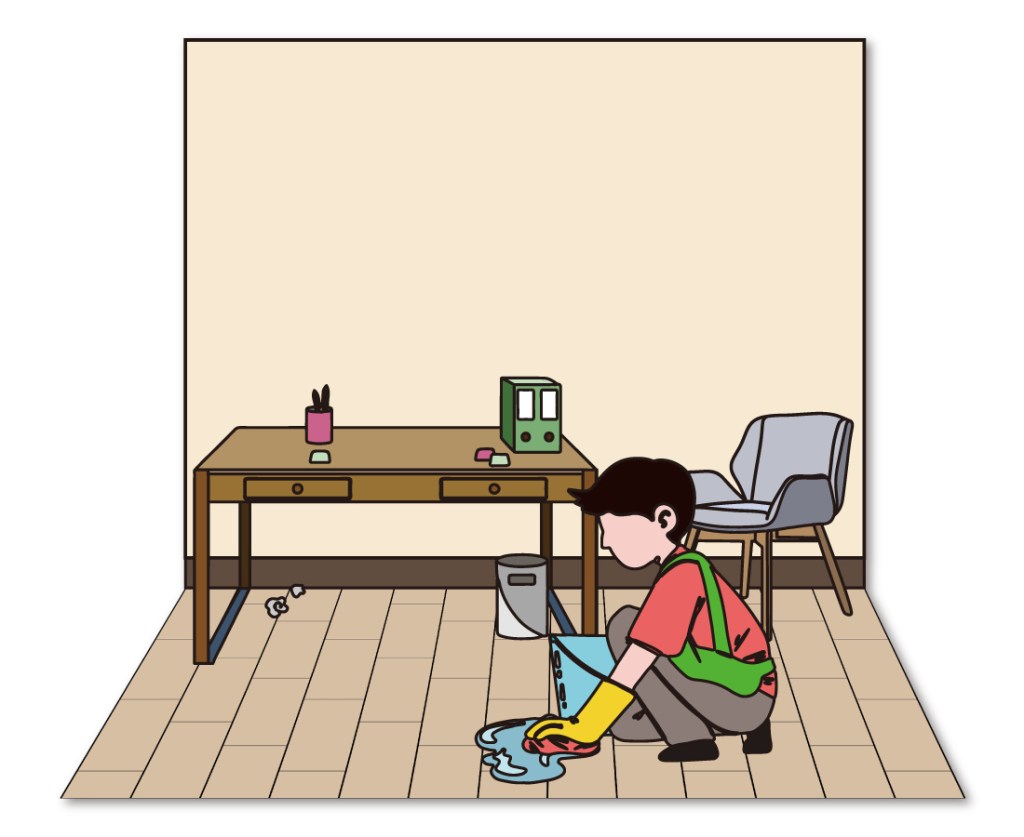 可直接使用掃把及吸塵器清潔,也可用清水沾濕拖把後擰乾拖地,油性污漬請 使用中性清潔劑。